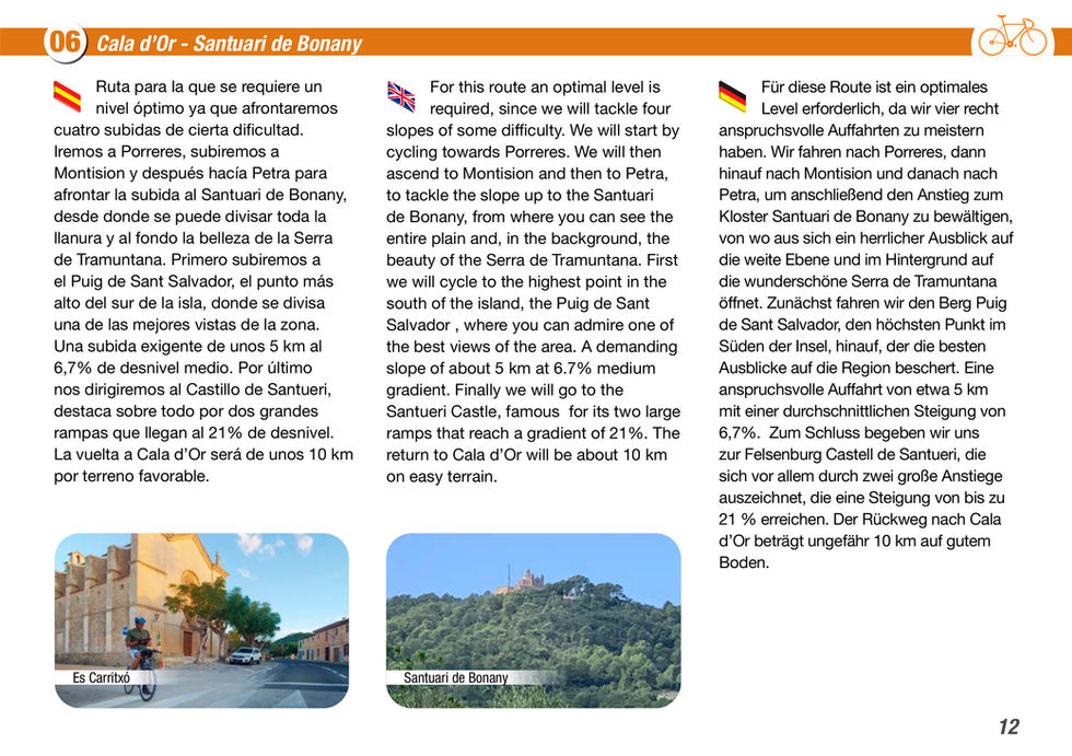 In enger Zusammenarbeit mit allen Verantwortlichen ist ein Routenverzeichnis mit 19 Fahrrad-Routen unterschiedlichen Schwierigkeitsgrades entstanden, das - ausgehend von Mallorcas Südosten - sowohl für professionelles Training als auch für Hobbytouren geeignet ist. Dabei handelt es sich um 12 Rennrad-Touren (orange) und 7 Strecken für Mountainbiker (blau). Mobil ggf. im Querformat für bessere Lesbarkeit anschauen.